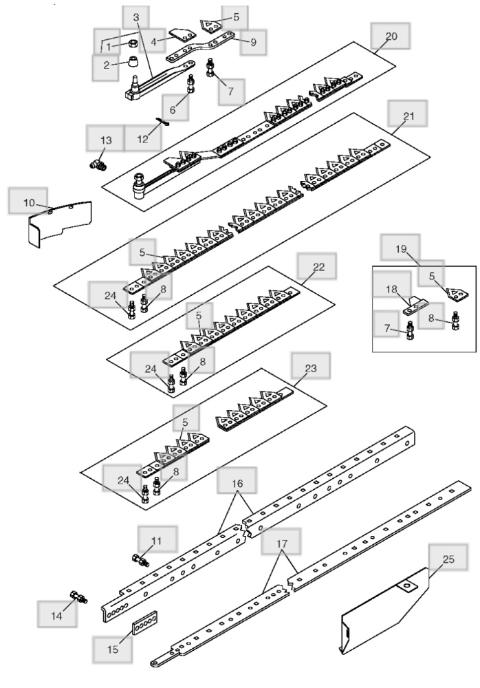 17 планка коси H106252 - 913 FLEX 17 планка коси H123445 - 915 FLEX 17 планка коси H106255 - 918 FLEX 17 планка коси H106256 - 920 FLEX 17 планка коси H106257 - 922 FLEX 17 планка коси H128967 - 925 FLEX AND 925 FLEX ARGENTINA 17 планка коси H113182 - 930 FLEX AND 930 FLEX ARGENTINA 18 кінець коси H136958 19 комплект кінця коси AH138236, (FLEX) (915, 918, 920, 922,925 AND 930) (SUB AH213837) 19 комплект кінця коси AH213837, ((2) H125890, (14) H125892, H136958, (6) H207929) 20 коса (перша частина - дрібна насічка бег пятки) KXE10214, AH213833, AH156870, AH140379 (914, 915, 918, 920,922, 925, 930) 21 коса (середня секція - дрібна насічка) AH140380 (914, 915, 918, 920, 922 - 1USED) (925 AND 930 - 2 USED) (SUB AH213834) 21 полопно коси (середня частина) AH213834 22 коса (середня частина) AH140381 на жатку (918, 920) 22 коса (середня частина) AH213835 23 коса (середня частина - дрібна насічка) AH140382 на жатку (922 AND 930) 23 коса (середня частина - дрібна насічка) AH213836 на жатку (922 AND 930) 24 болт М10х50 19M7806 24 гайка М10 H135891 25 щит H176040, (SUB FOR AH152452) .. комплект AH172791: (SUB AH214873) (INCLUDES PARTS MARKED (A)) .. комплект AH214873 .. комплект AH202442 .. комплект AH211795: (INCLUDES AH121075, (7) H125892, (7) H166262 AND JD7781) NLA;ORDER KXE10217 .. комплект KXE10217 .. комплект AH209438: (INCLUDES (10) H125890, (50) H125891, (65) H125892 AND (5) H166262) |