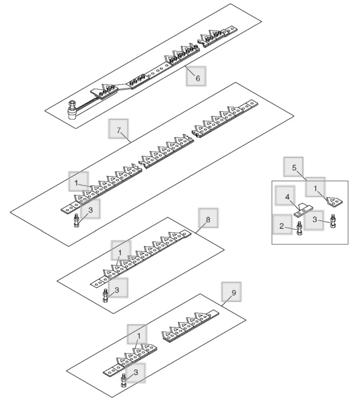 1 сегмент крупна насічка H160251, H168316, H207930 2 болт сегмента 0.216" X 0.709" H125890 2 гайка сегмента 5.486 mm (0.216") H125892 3 болт сегмента 0.216" X 0.551" H125891 3 гайка сегмента 5.486 mm (0.216") H125892 4 частина коси (права частина) H136958 5 кінцева частина коси (комплект) AH160163 / AH213832 (915, 918, 920, 922, 925 AND 930) (в комплект входить (2) H125890, (14) H125892, H136958, (6) H160251) (SUB AH213832)) з'єднувач коси на жатку John Deere 900 AH202442 |