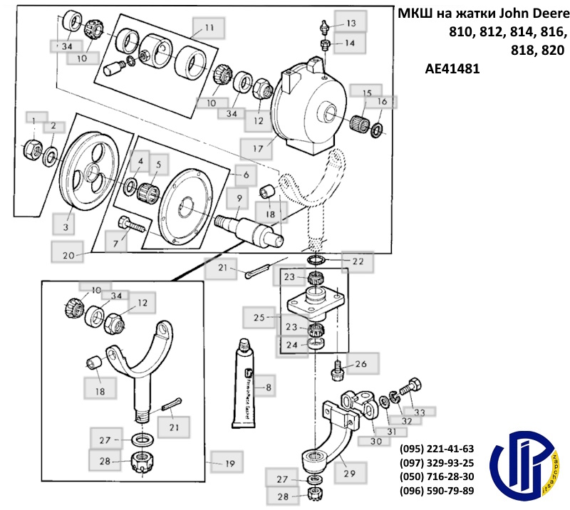 21 . . 11M7025 шплінт 4х50 вариант №1 21 . . 11M7032 шплінт 5х50 вариант №2 22 . . T14065 кільце 23 . . JD9861 підшипник 24 . . AE53177 сальник МКШ 25 . . AE35152 корпус підшипників МКШ 26 . . 19H3343 болт 5/8"X2" 27 . . E58308 шайба 19,8мм вариант №1 27 . . E87643 шайба 23мм вариант №2 28 . . 14H912 гайка 3/4" вариант №1 28 . . 14H875 гайка 7/8" вариант №2 29 . . H86911 ричаг привода коси 30 . . H98780 фланець (скоба) головвки коси 31 . . T29342 шайба 32 . . 12H301 шайба граер 1/2" 33 . . 19H2473 болт 1/2"X1-3/4" 34 . . JD9144 підшипник (зовнішня обойма) 35 . . AE57735 ремкомплект МКШ (вилка + вал МКШ) |