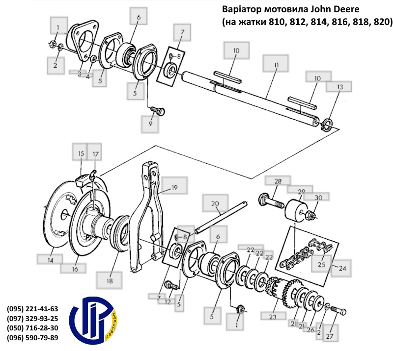 1 . . 14M7140 гайка М10 2 . . 12M7013 шайба гравер М10 3 . . Z38380 кришка 4 . . 14M7158 гайка М10 5 . . Z40973 корпус підшипника 6 . . JD39103 підшипник 7 . . AZ10045 втулка підшипника (ексцентрик) 8 . . 22M7080 штіфт М8х8 9 . . 03M7085 болт М10х30 10 . . 49M4837 шпонка 8х7х56мм 11 . . Z45322 вал (ORD Z54071 AND Z54090) 11 . . Z54071 вал (SUB FOR Z45322) 12 . . 03M7088 болт М10х20 13 . . 40M1831 кільце стопорне 30х1,5 Z45322 13 . . Z54090 кільце стопорне 30х2,0 Z54071 14 . . Z11818 диск варіатора рухомий 15 . . Z30692 пас аріатора |