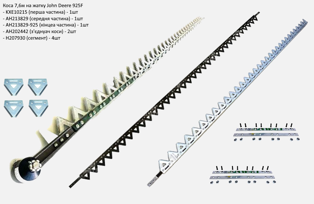 Коса 7,6м на жатку John Deere 925F KXE10215 (коса перша частина - 1шт), AH213829 (коса середня частина - 1шт), AH213829-925 (коса кінцева частина - 1шт), AH202442 (з'єднувач коси - 2шт), H207930 (сегмент - 4шт) ![]() |
