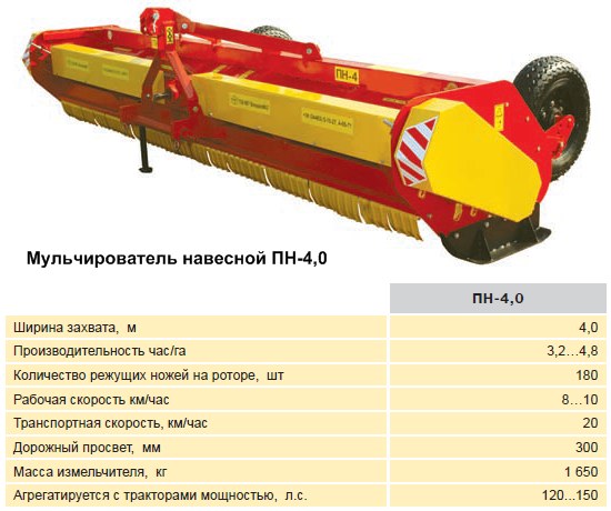 Мульчирователь ПН-4,0 предназначен для измельчения послеуборочных остатков кукурузы, пшеницы, ячменя, подсолнечника, рапса и других культур с равномерным распределением по поверхности почвы измельченных остатков. Высокая плотность расположения универсальных ножей с двусторонней заточкой, их профиль и масса обеспечивают идеальное измелечение растительных остатков. В привод ротора установленна обгонная муфта, которая устраняет динамические нагрузки на трансмиссию при остановке ВОМ.