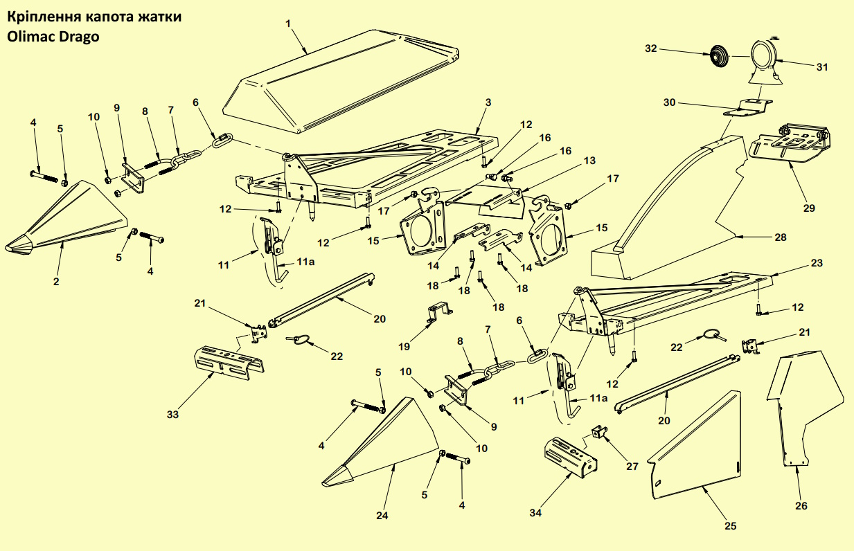 Запчастини на кріплення копота Olimac Drago 1 . . DR15020 капот середній 30" 2 . . DR15050 носок середній 30" 3 . . DR15080 рамка капота 30" 4 . . DR15100 болт 5 . . DR15110 гайка 6 . . DR15120 зєднувальна ланка 7 . . DR15130 ланцюг 8 . . DR15140 стремянка 9 . . DR15160 скоба кріплення 10 . . DR15190 гайка 11 . . DR15500 замок 11A . . DR15510 замок 12 . . DR15200 болт 13 . . DR15210 скоба кріплення 30" 16 . . DR15270 болт 17 . . DR15280 гайка 18 . . DR15290 болт 20 . . DR15310 тримач |