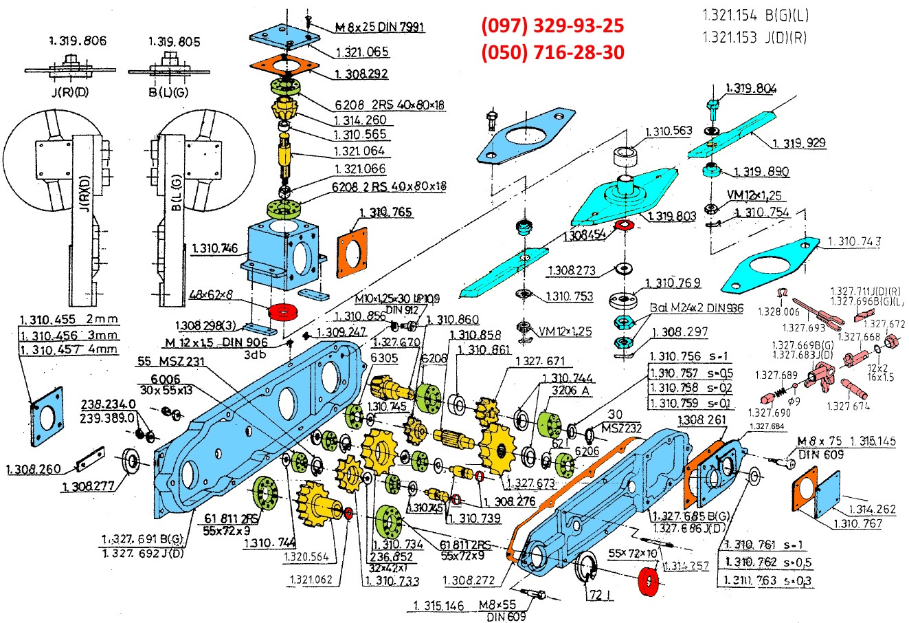 1.310.746 корпус привода ножів 1.321.065 кришка корпуса привода ножів 1.308.292 прокладка вершня корпуса ножів 1.310.765 прокладка бокова корпуса ножів 1.314.260 шестерня корпуса ножів 1.321.064 вал корпуса ножів 1.310.565 втулка (верхня) корпуса ножів 1.321.066 втулка (нижня) корпуса ножів 1.319.929 ніж подрібнювача OROS L-225мм D-30мм 1.319.890 втулка ножа подрібнювача 1.319.804 болт ножа подрібнювача М12х45х1,25 1.319.803 тримач ножів OROS 1.308.454 кільце гумове шліцеве 1.310.563 втулка тримача ножів 1.310.743 пластина тримача ножів 1.327.683 кронштейн відкючення різки правий 1.327.674 вал відключення різки 1.327.668 вал відключення різки 1.327.690 гвинт установочний відключення ножів 1.327.689 пружина відключення ножів 1.327.693 вилка відключення різки 1.327.672 гайка 1.322.957 редуктор різки правий 1.321.154 редуктор різки лівий |