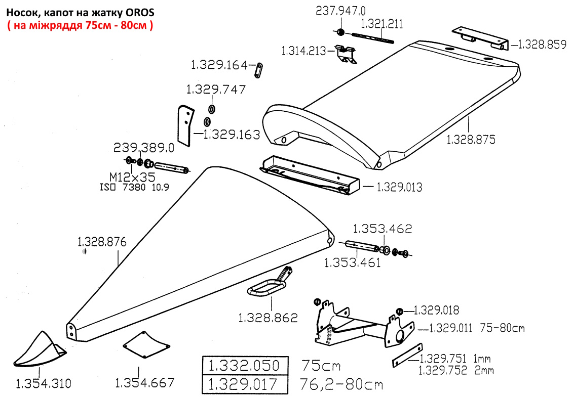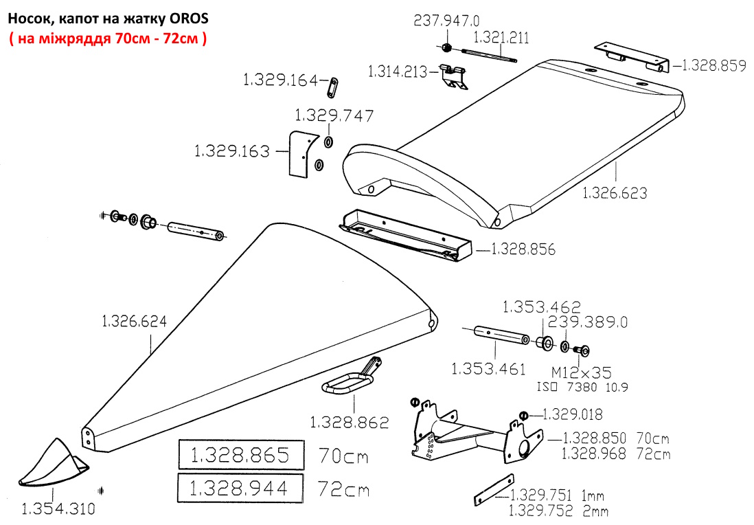 1.354.310 накінечник носка 1.326.624 носок жатки ОРОШ 1.326.623 капот 1.329.163 уловлювач качана 1.329.164 планка уловлювача качана 1.328.862 опора носка жатки 1.328.850 кронштейн кріплення носка 70см 1.353.461 вал носка жатки 1.353.462 втулка |