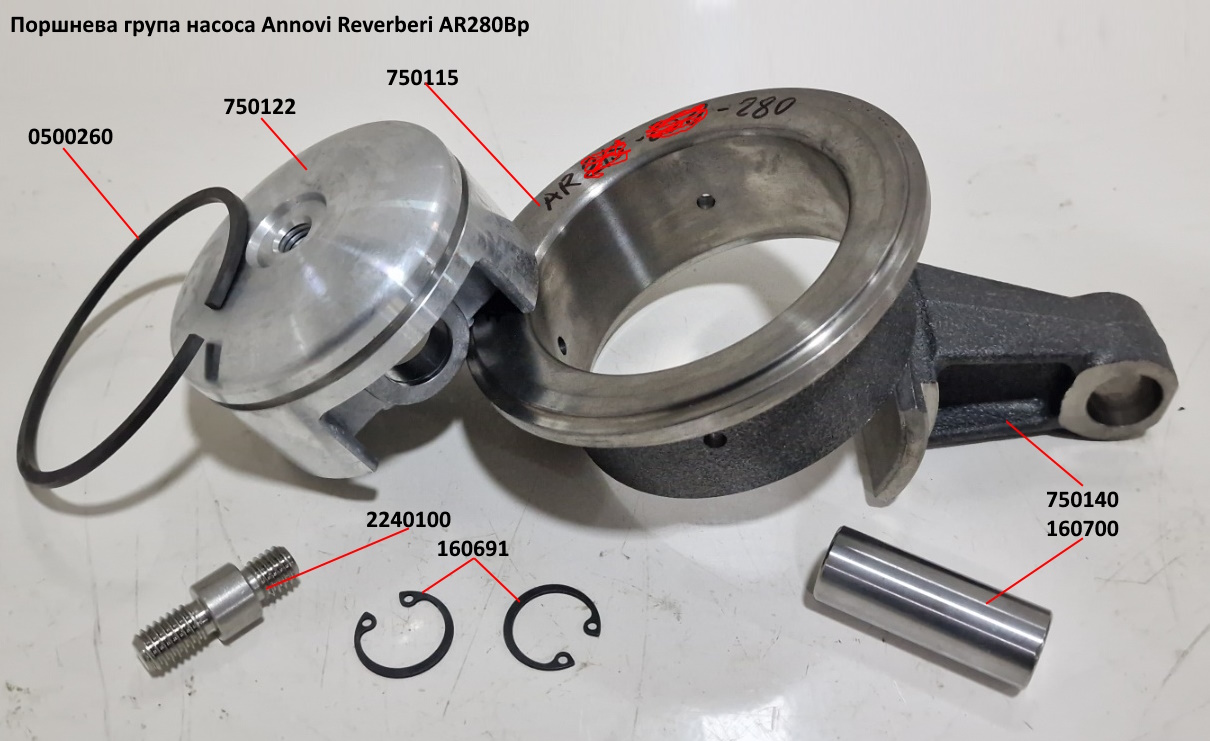 1 750870 фітінг вхідний (прямий) 50мм 1 750730 фітінг вхідний (прямий) 60мм 3 750071 болт М12х70 4 750200 ніжка насос (старого зразка) 5 750740 кільце гумове 56,74х3,53 (всмоктуючого патрубка) 6 751070 впускний колектор 7 380242 гайка М8 8 751350 кришка насоса 9 680070 кільце гумове 31,5х4,25 (клапана) 10 759051 клапан насоса 11 200390 кільце стопорне W62 12 750176 вал насоса AR215bp 12 750176 вал насоса AR250bp 12 750176 вал насоса AR280bp 13 750117 гільза насоса AR215bp 13 750110 гільза насоса AR250bp 13 750115 гільза насоса AR280bp 14 750061 болт М12х65 15 680350 гвинт М8х35 16 1040060 кільце гумове 72,69х2,62 (кришки масляного бачка) 17 750053 кришка масляного бачка AR215bp (зелена) 17 750057 кришка масляного бачка AR250bp (чорна) 17 750052 кришка масляного бачка AR280bp (червона) 18 750030 масляний бачок без кришки 19 750040 прокладка масляного бачка 20 750010 корпус насоса 21 851360 кільце гумове 120,32х2,62 (передньої кришки) 22 680020 передня кришка насоса 23 160672 болт М10х25 24 751130 перехідник патрубока колектора 25 390290 кільце гумове 29х3,0 (напірного фітінга) 26 750670 гайка 1 1/2" 27 3040160 патрубок напірний 35мм 28 2420181 кришка передня (вариант №2) 29 650640 гвинт М10х25 30 550080 мембрана насоса (гума) 30 550085 мембрана насоса (десмопан) 31 760940 фітінг напірний д.35мм (прямий) 32 500260 кільце поршня компресійне 33 750122 поршень насоса 34 751080 колектор нагнітальний 35 160700 палець поршневий 36 160691 кільце стопорне W18 (пальця шатуна) 37 750140 шатун насоса 38 750090 підшипник шатуна 39 750130 шайба фіксації шатуна 40 540040 кришка |