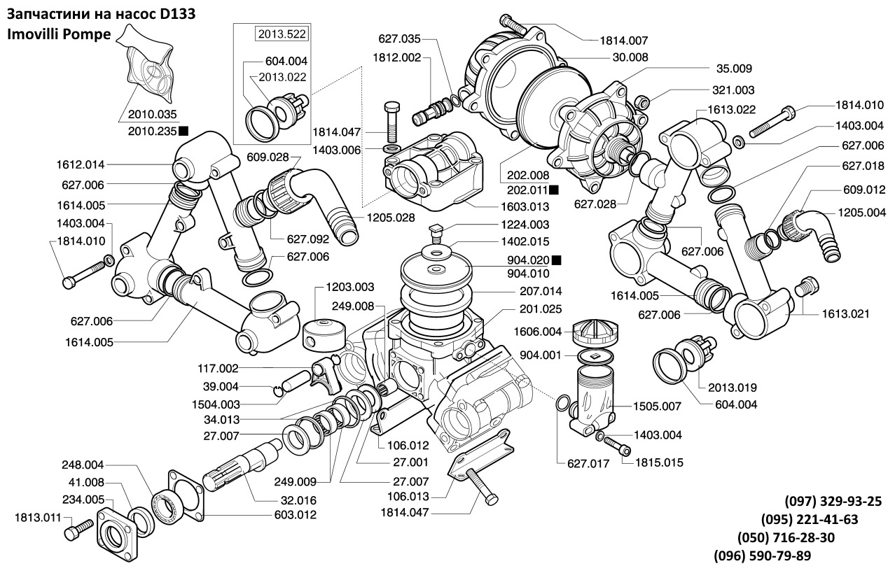 904.020 мембрана на насос D133 (гумова) 904.010 мембрана на на насос D133 (десмопанова) 202.008 мембрана повітряна D133 (гумова) 202.011 мембрана повітряна D133 (десмопанова) 2013.522 клапан насоса D133 (з кільцем) 2013.022 клапан насоса D133 604.004 кільце клапана 2010.035 ремкомплект насоса D133 (гумовий) 2010.235 ремкомплект насоса D133 (десмопановий) 1613.021 патрубок напірний (під фітінг 1") 1613.022 патрубок напірний (під повіт.камер. 42х2 1614.005 патрубок напірний / всмоктувальний (глухий) 1205.004 фітінг напірний д.25мм 1" 609.012 гайка 1" 627.018 кільце гумове (напірного фітінга) 627.006 кільце гумове (партрубків) 627.028 кільце гумове (повітряної камери) 627.035 кільце гумове (золотника повіт.камери) 30.008 кришка повітряної камери 35.009 корпус повітряної камери 1812.002 золотник повітряної камери 1814.007 болт М8х40.8.8 1814.010 болт М8х55.8.8 (кріплення напірного кол.) 1505.007 бачок масляний D133 1606.004 кришка масляного бачка 904.001 кільце кришки 627.017 кільце гумове масляного бачка |