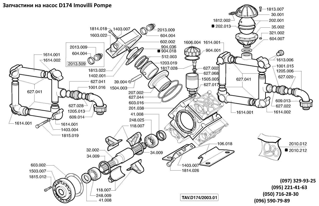 904.036 мембрана насоса D174 (гумова) 904.018 мембрана насоса D174 (десмопанова) 2013.509 клапан насоса D174 (з ущільненням) 2013.009 клапан насоса D174 604.004 кільце клапана D174 202.001 мембрана повітряна насоса D174 2010.012 ремкомплект насоса D174 (гумовий) 2010.212 ремкомплект насоса D174 (десмопановий) 1614.002 патрубок напірний / всмоктуючий (під фітінг 1"1/4) 1613.006 патрубок напірний (під повіт.камеру 42х2) 1614.001 патрубок напірний / всмоктувальний (глухий) 1205.006 фітінг напірний д.25мм 1"1/4 609.013 гайка 1"1/4 1001.015 фітінг перехідник 1"1/4 627.020 кільце гумове (напірного фітінга) 627.022 кільце гумове (перехідника) 627.041 кільце гумове (патрубків) 604.007 кільце гумове (кріпленя повіт.камери) 30.001 кришка повітряної камери D174 35.002 корпус повітряної камери D174 1812.002 золотник повітряної камери 1813.007 болт М6х30.8.8 1505.005 бачок масляний насоса D174 1606.004 кришка масляного бачка D174 904.001 ущільнення кришки 627.017 кільце гумове (масляного бачка) 1817.028 болт кріплення бачка |