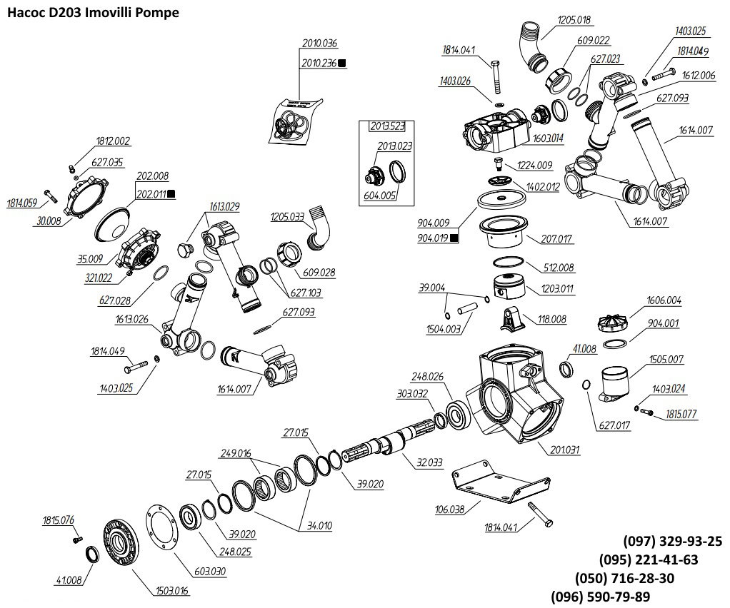 1603.014 кришка насоса D203 1224.009 болт прижима мембрани 1402.012 прижим мембрани 207.017 гільза насоса D203 512.008 кільце поршня 1203.011 поршень насоса D203 1504.003 палець поршня 16мм 39.004 кільце стопорне пальця W16 118.008 шатун насоса D203 201.031 корпус насоса D203 106.038 площадка насоса D203 41.008 сальник 35x47x7 248.026 підщипник 6307 303.032 втулка 32.033 вал насоса D203 39.020 кільце стопорне W52 27.015 шайба 34.010 кільце фіксації шатуна 249.016 підшипник шатуна RNA4909 248.025 підшипник 6207 603.030 прокладка 1503.016 кришка насоса 1815.076 болт (передньої кришки) 1814.041 болт М12х85 8.8 UNI5737 (кришки) 1814.049 болт М10х70 8.8 UNI5737 (кріплення колектора) 1814.059 болт М8х40 8.8 UNI5737 (повітряної камери) 1814.041 болт М12х85 8.8 UNI5737 (кріплення платформи) 1815.076 болт М8х20 8.8 UNI5931 1815.077 болт М8х30 8.8 UNI5931(кріплення масляного бачка) |