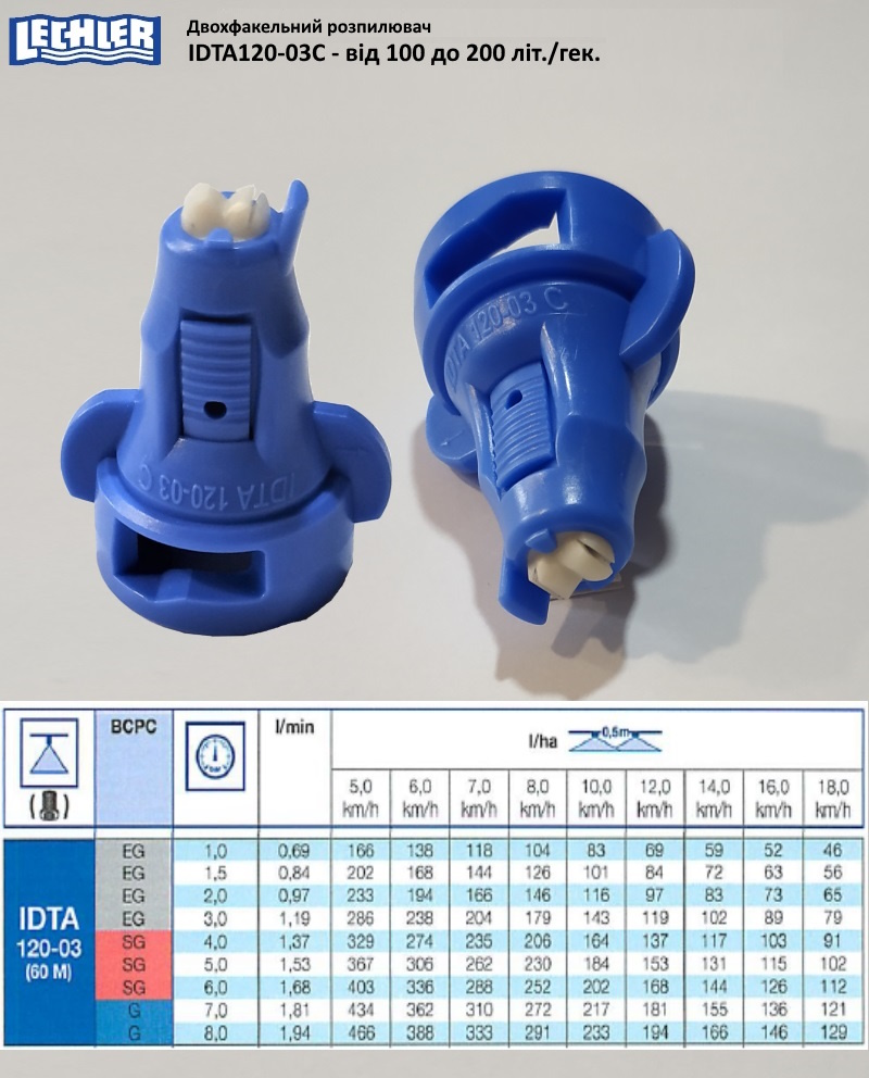 Позначення розпилювачів IDTA Lechler розпилювач IDTA120-02 жовтий розпилювач IDTA120-025 фіолетовий розпилювач IDTA120-03 синій розпилювач IDTA120-04 червоний розпилювач IDTA120-05 коричневий розпилювач IDTA120-06 сірий розпилювач IDTA120-08 білий |