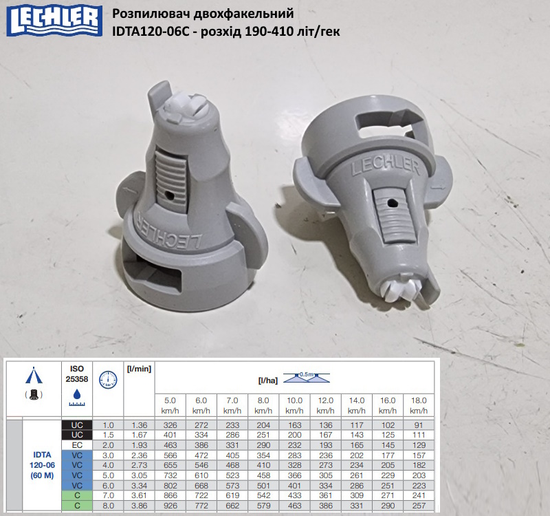 Форсунка IDTA є довгим інжекторним двофакельним розпилювачем з асиметричними кутами атаки факелів і є базовою для внесення ґрунтових і страхових гербіцидів, фунгіцидів на ранніх етапах розвитку рослин, обробки колосу і, звичайно, для внесення інсектицидів на високих робочих швидкостях.