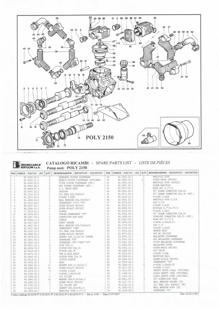 Запчастини до насосу POLY-2150 Bertolini (Італія) 1 . 62.0040.00.2 мембрана десмопан 1 . 62.0040.31.2 мембрана оригінал 1 . 62.0040.33.2 мембрана Viton 1 . 62.0040.36.2 мембрана 2 . 28.9809.97.3 клапан насоса 3 . 53.0007.32.2 захист 4 . 80.2143.10.2 манжета 35х52х7 5 . 80.3310.00.2 обручка 4,0х82 6 . 81.2846.00.2 підшипник 6207 7 . 62.0010.26.2 вал 1"3/8 8 . 86.3187.50.2 болт М10х18 UNI5931 8 . 86.3264.00.2 болт М10х25 UNI5931 9 . 17.0016.61.2 кришка передня 10 . 62.0029.09.2 втулка 11 . 98.0047.76.2 втулка розбігу 12 . 62.0008.11.2 шатун 13 . 28.0027.09.2 шайба 14 . 81.2837.00.2 підшипник 6007 15 . 62.0027.26.2 вал "VDA" 16 . 80.2143.10.2 манжета 35х52х7 17 . 86.3694.50.2 болт М12х20 UNI5931 18 . 82.4079.00.2 шайба 13,2х17х1 19 . 62.0001.09.2 корпус "VS" 19 . 62.0030.09.2 корпус "VD"-"VDA"-"VC" 20 . 80.0021.00.2 кільце стопорне пальця поршня 21 . 85.2006.70.2 палець поршня 22 . 62.0018.09.2 поршень 23 . 60.6475.00.2 запчастини на насос 24 . 81.8540.00.2 кільце поршня 25 . 62.0019.01.2 гільза 28 . 62.0025.32.2 кришка 29 . 84.3844.50.2 шайба 30 . 86.4068.00.2 болт М12х75 31 . 80.3314.00.2 кільце клапана 4,5х40 32 . 80.3180.00.2 обручка 2,62х15 (масляного бачка) 33 . 23.0008.32.2 олійний бачок 34 . 84.3685.50.2 шайба 8,2 х15х1, 5 35 . 86.2682.50.2 болт М8х25 |