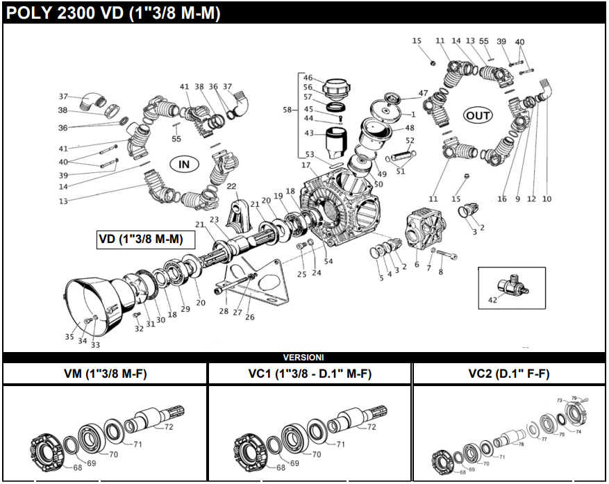 29. 81.2876.00.2 підшипник (розмір 35x100x25) 30. 91.0110.72.2 прокладка 31. 14.0011.09.2 кришка передня 32. 86.2562.50.2 гвинт M8x20 UNI5931 33. 84.3696.00.2 шайба 8,4x18x2 34. 86.2682.50.2 болт M8x25 UNI5931 35. 31.1482.32.2 захист кардана L=182 35. 31.1468.32.2 захист кардана L=135 36. 80.3209.10.2 кільце 2,62x40.95 37. 84.0610.00.2 фітінг 50мм коліно 90град. 37. 84.1643.00.2 фітінг 50мм прямий 38. 82.0120.00.2 гайка G.2" 39. 84.3697.00.2 шайба 8,4x18x2 40. 86.3044.50.2 болти M8x90 UNI5931 41. 14.0032.32.2 патрубок колектор випускний G 2” 42. 24.3016.97.3 запобіжний клапан 15bar 43. 14.0117.32.2 корпус масляного бачка 44. 84.3585.00.2 шайба 6,4X12,5X1,6 45. 86.2168.00.2 гвинт M6x22 UNI5931 46. 28.0144.32.2 кришка масляного бачка 47. 62.9811.97.3 прижим мембрани 48. 62.0021.01.2 гільза насоса POLY-2300 49. 81.8540.00.2 кільце поршня 78мм 50. 62.0018.09.2 поршень насоса 78мм POLY-2260 51. 80.0021.00.2 кільце стопорне 15мм 52. 85.2006.70.2 палець поршня 15мм 53. 80.3209.00.2 кільце 2,62x39,34 54. 80.1369.00.2 кільце стопорне 52мм 55. 85.1161.00.2 шплінт D.4 X 45 56. 41.0017.31.2 прокладка 57. 14.0116.32.2 ущільнення 58. 14.9888.97.3 бачок масляний в зборі |