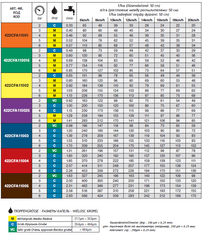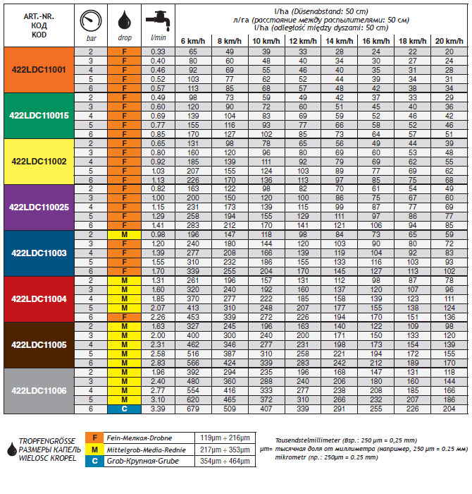 • У распылителей Twin Fan Low Drift такой же расход, как и у моделей Twin Fan Standard, только более крупный размер капель гарантирует снижение явления сноса.