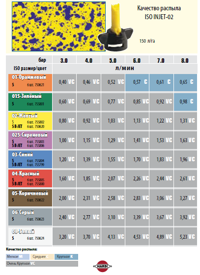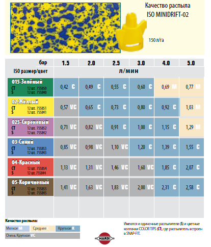 HARDI ISO MINIDRIFT Воздушно-инжекторный распылитель Распылители MINIDRIFT создают еще более крупные фракции капель (Крупные/Очень Крупные), что позволит закончить опрыскивание даже при более сильном ветре, при этом рабочее давление и норма расхода останутся прежними. Распылители HARDI ISO MINIDRIFT можно использовать для опрыскивания при неблагоприятных погодных условиях Данный тип распылителей снижает снос ветром даже при низком давлении в системе опрыскивателя, за счет создания спектра капель от Крупных до Очень Крупных. Но при этом, качество покрытия будет ниже, чем на плоскоструйных распылителях. Тадлица расхода для распылителя HARDI ISO MINIDRIFT ![]() ![]() • Air inclusion for greater drift reduction • Working pressure 1 to 5 bar • 110 degree wide fan pattern • ISO flow, colours, sizes and dimensions • SYNTAL – precision moulded thermoplastic • Boom heights from 40 to 90 cm (50 cm optimum) |