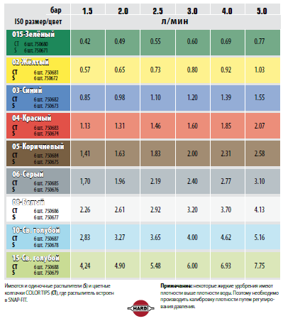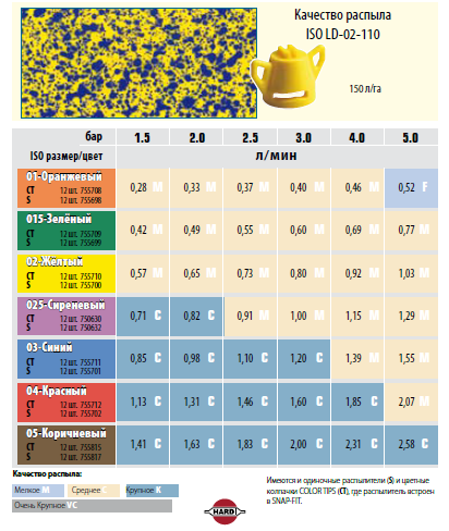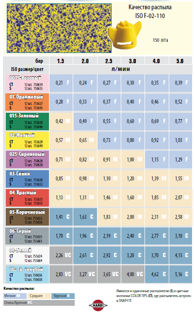 HARDI ISO F 110 Стандартный плоскоструйный распылитель Основной многоцелевой плоскоструйный распылитель. В большинстве случаев обеспечивает максимальное покрытие и великолепное равномерное распыление. Эти распылители можно рекомендовать для обработки любыми пестицидами. Мелкая фракция капель, выходящая из данного типа распылителей, обеспечивает максимальное покрытие растений и, следовательно, высокую биологическую эффективность. Это оптимальный тип распылителей для применения с системой HARDI TWIN. Тадлица расхода для распылителя HARDI ISO F-110 ![]() ![]() • ISO flow, colour and outer dimensions • 1.5 to 5 bar working pressure • 110 degree wide fan pattern • Ideal for TWIN Sprayers • SYNTAL precision moulded thermoplastic |