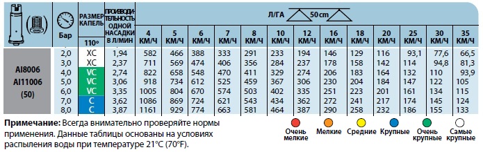 Характеристики распылителя AI TeeJet: