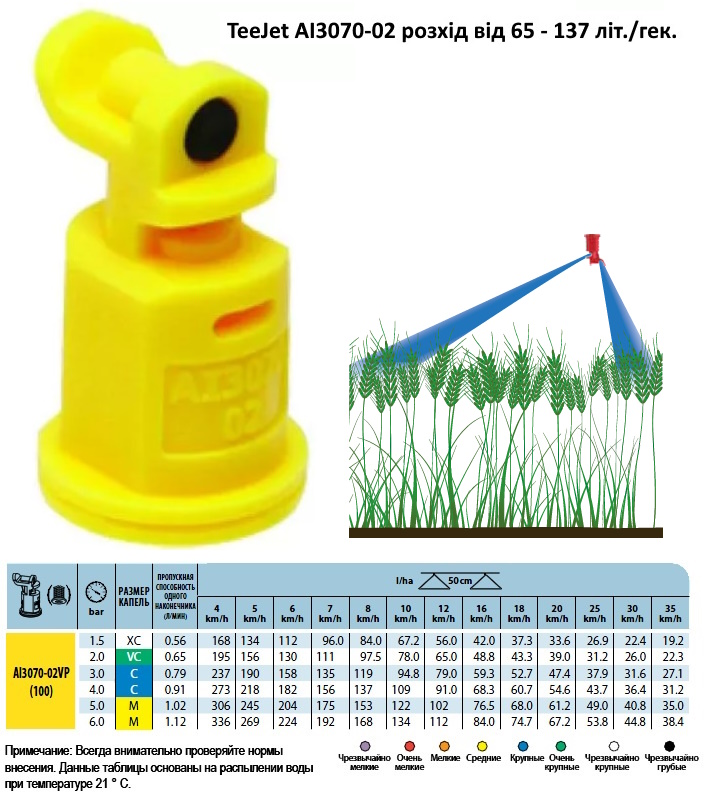 Використовуючи запатентований дизайн, плоскоструйний наконечник AI3070 TeeJet з подвійною моделлю розпилення надає одночасно дві моделі розпилення на додаткових при кутах 30 ° і 70 ° від горизонталі. Передня модель частини насадки забезпечує покриття нижньої частини культури та проникнення для покриття ділянок під рослинним покривом. Задня частина частина насадки забезпечує повне покриття верхньої частини рослинного покриву культури. AI3070 ідеально підходить для внесення фунгіцидів та боротьби з хворобами зернових культур.