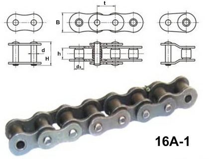 Параметры цепи 16A-1 шаг цепи t = 25,4 мм диаметр оси d = 7,93 мм диаметр ролика d3 = 15,88 мм ширина наружная H = 38 мм ширина внутренняя h = 15,88 мм высота цепи B = 23,8 мм |