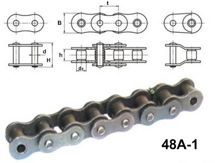 Параметры цепи 48A-1 шаг цепи t = 76,2 мм диаметр оси d = 23,8 мм диаметр ролика d3 = 47,63 мм ширина наружная H = 104 мм ширина внутренняя h = 47,63 мм высота цепи B = 71 мм |