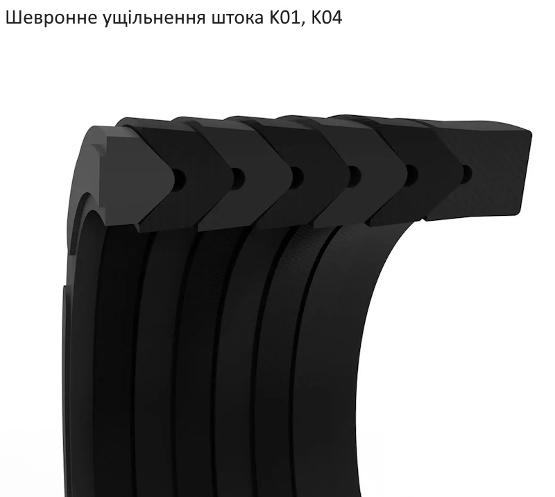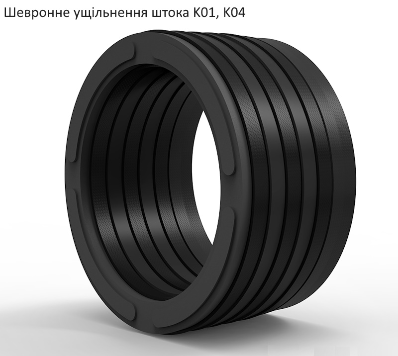 Шевронний ущільнень К01 односторонньої дії, що складається з одного опорного кільця з зміцненої бавовняної тканини, одного натискного кільця з термопластичного матеріалу, кілець з зміцненої бавовняної тканини, залежно від висоти пакета їх кількість варіюється, і еластичних проміжних кілець. Може застосовуватися як ущільнення штока, так і поршня. Характеристика ущільнення ![]() ![]() |